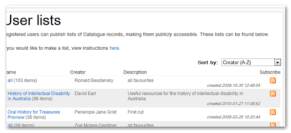 User lists also have great potential for NLA staff. User lists could be created for a range of research areas, and each list could be updated as new items are acquired by the library. This way, researchers from a range of disciplines could be easily informed about new publications in their field.