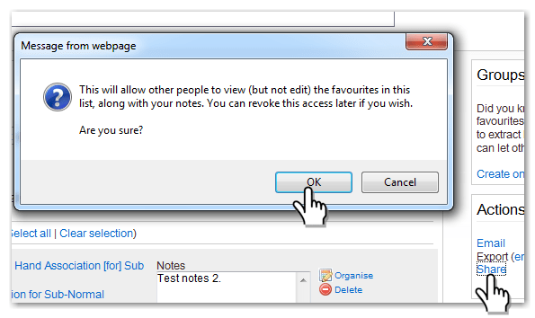 Once you have a group ready to go, you can make it public by selecting the “share” link in the “Actions” box on the right hand side of your items. Once the group is shared, you have the option of “un-sharing” it. Next to the “un-share” link there will also be a direct link to your list: “view.” This is a stable URL, so you can then email the link, or post it to a website.